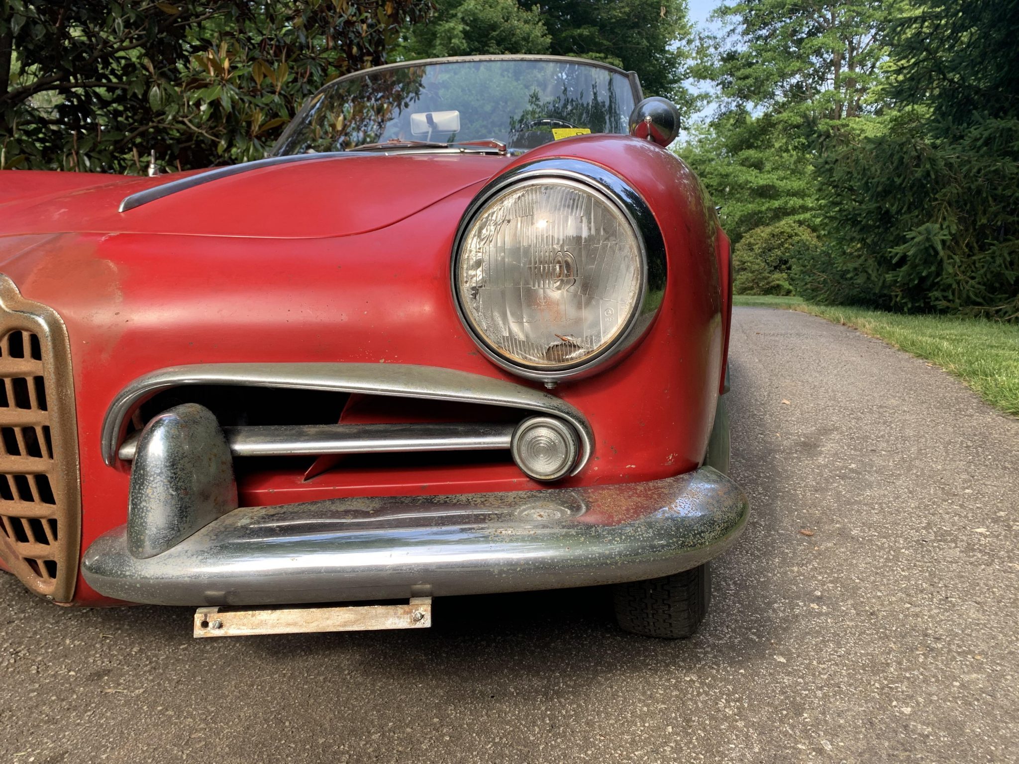 The Pinin Farina-styled body wears aged red paint with areas of burn-through and features an unrestored black convertible top as well as a Talbot Berlin fender mirror that was installed by the original owner. Close-up photos of the body, top, brightwork, Carello lenses, and other details can be seen in the gallery below.