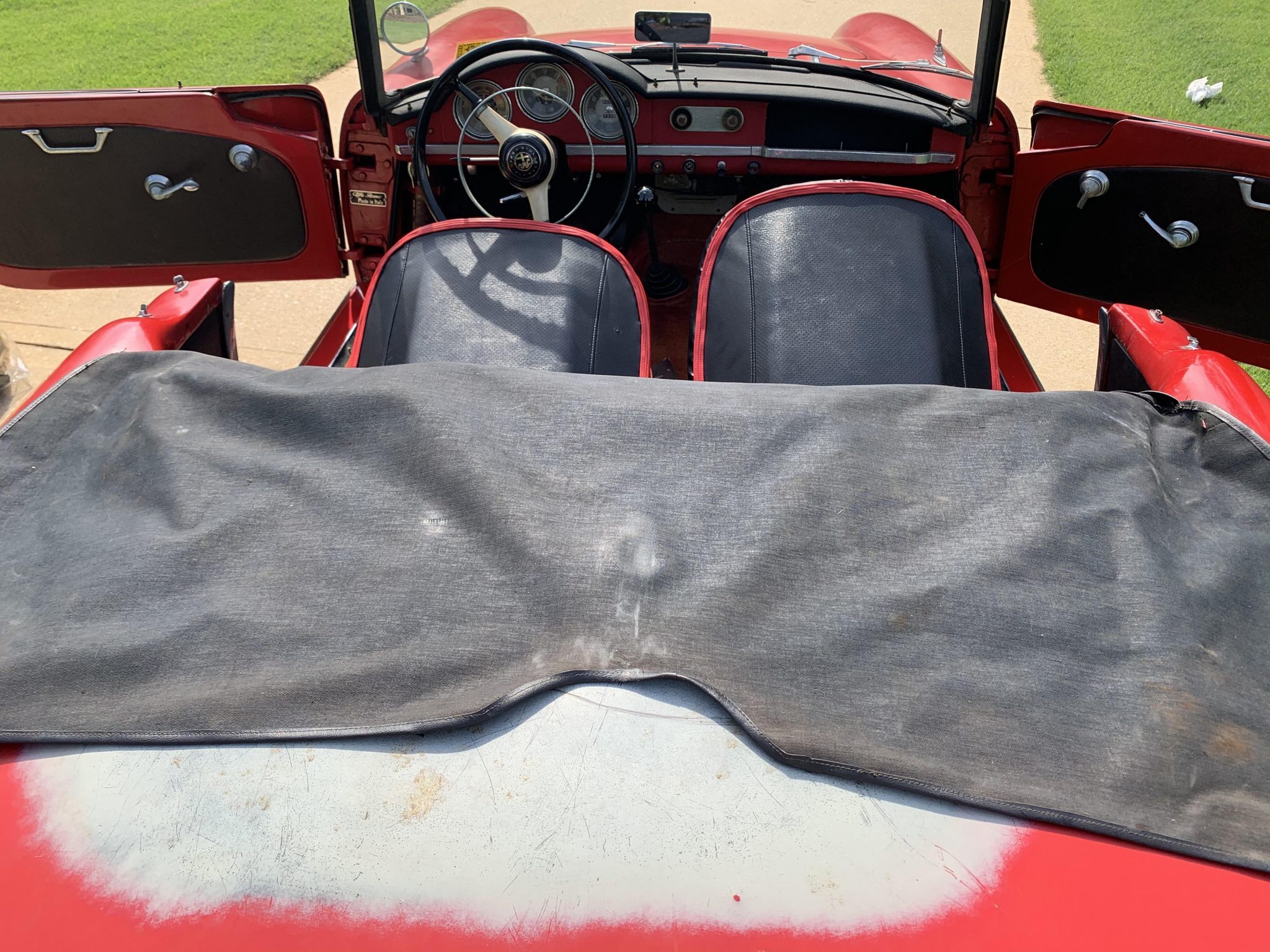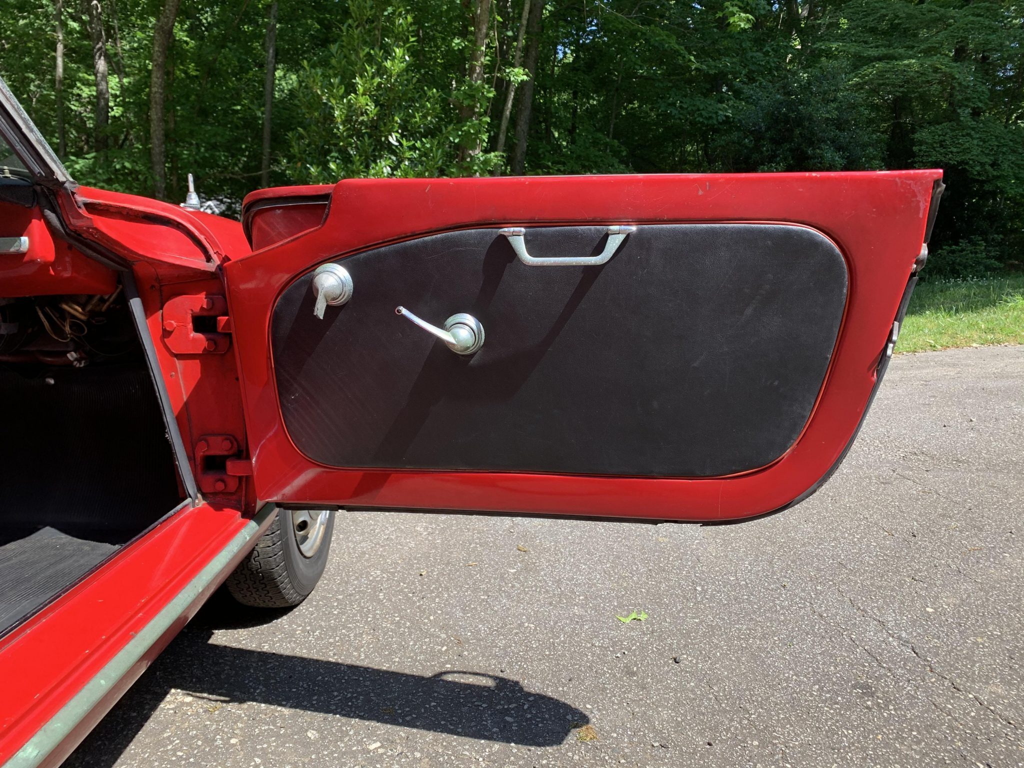 The seats have been reupholstered in black vinyl with red piping under current ownership, and are joined in the cockpit by older red carpeting and black rubber floor mats. Interior equipment consists of latch-and-link lap belts, a dash-mounted rearview mirror, a fire extinguisher, a heater, and a period Motorola AM radio. The seller notes that sections of the interior door handles have broken off.
