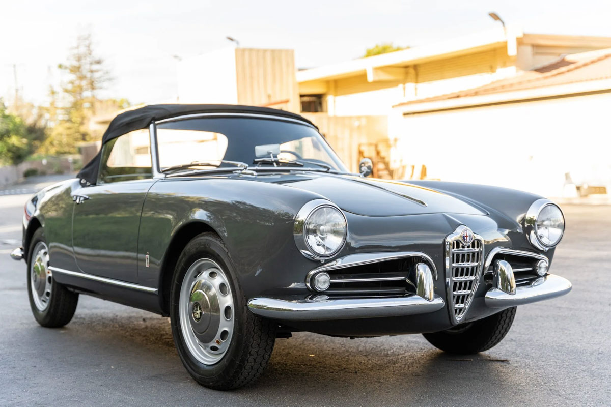 This 1959 Alfa Romeo Giulietta Spider Veloce 750F was produced on December 3, 1958, and was delivered new to the Hoffman Motor Car Company of New York City. A refurbishment of the car under previous ownership included a repaint in gray over a reupholstered red leather interior in addition to overhauls of its 1.4L twin-cam inline-four and four-speed manual transmission. Features include a black convertible top, dual Weber carburetors, and 15” Ruote Borrani steel wheels. The car was acquired by the seller on BaT in April 2022, and maintenance in the time since has included servicing and synchronizing the carburetors, adjusting the clutch pressure plate, changing the oil and coolant, bleeding the brakes, and replacing the headlamps, speedometer cable, and rearview mirror glass. This Veloce 750F is now offered with refurbishment records and photos, the seller’s service records, and a clean California title in the seller’s name.