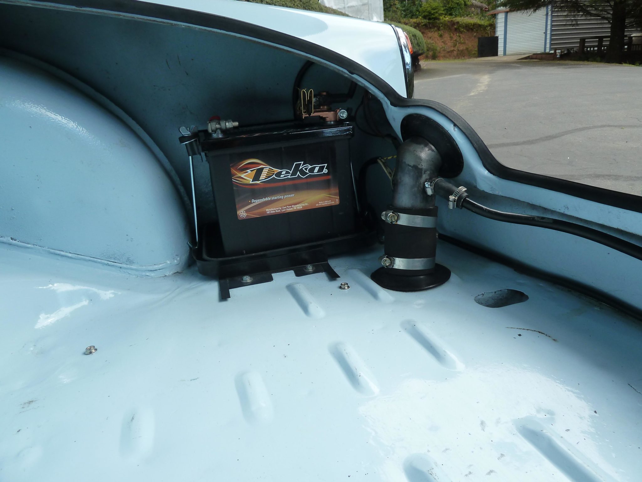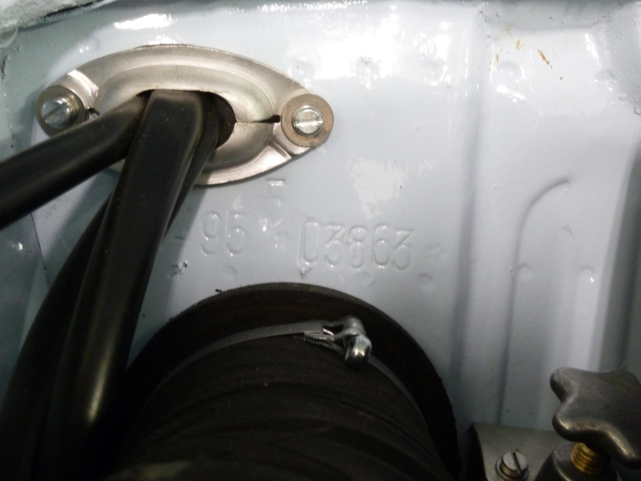 The cockpit is trimmed in replacement black upholstery with a steel wrinkle-finished dash cap, black door panels, blue piping, and Radici Wilton wool carpets covered by reproduction molded floor mats sourced from Re-Originals, Inc. Lap belts are fitted along with a five-speed Giulietta shifter wearing a blue boot.