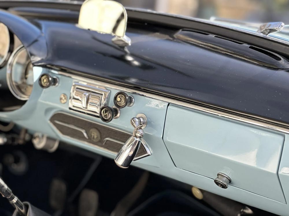 Confortevole (comfortable) refers to the Giulietta Sprint Veloces built from chassis 1493E05834 to 1493E06611, and they were conceived as a more deluxe version of the contemporary Alleggerita (lightweight) variant. This example’s steel bodywork left the factory finished in Azzurro Nube (AR 305) and was stripped, repaired, and repainted as part of the aforementioned refurbishment. Various chrome and aluminum trim pieces have been refinished, and further exterior details include Bertone fender badges, vented rear quarter windows, US-spec taillights, and a single exhaust outlet with a polished finisher. The seller notes scratches on the windshield.