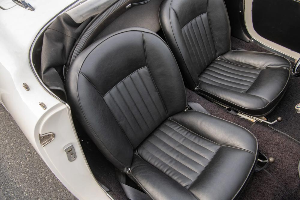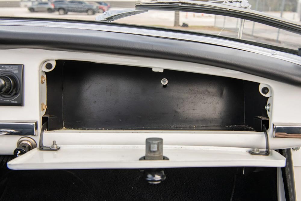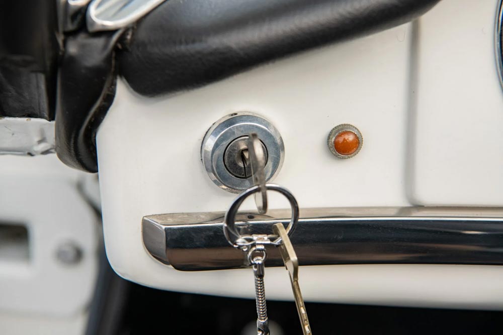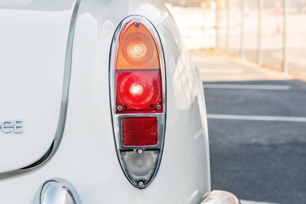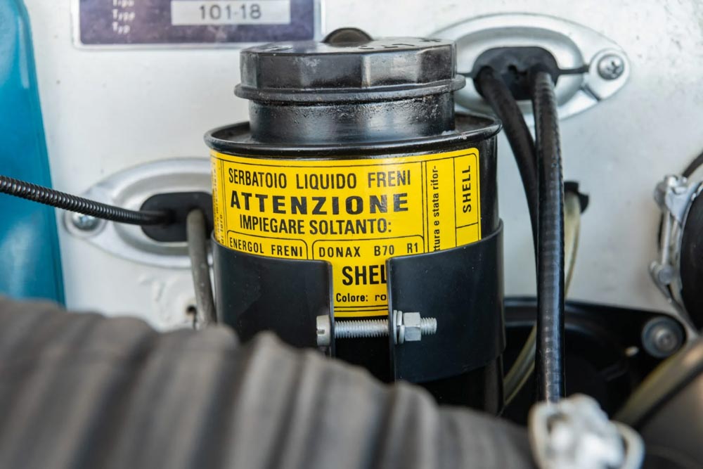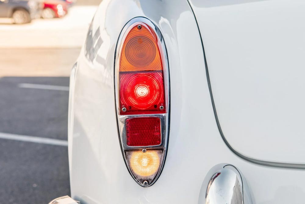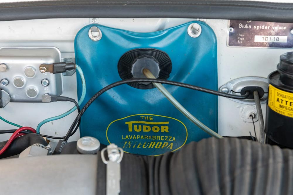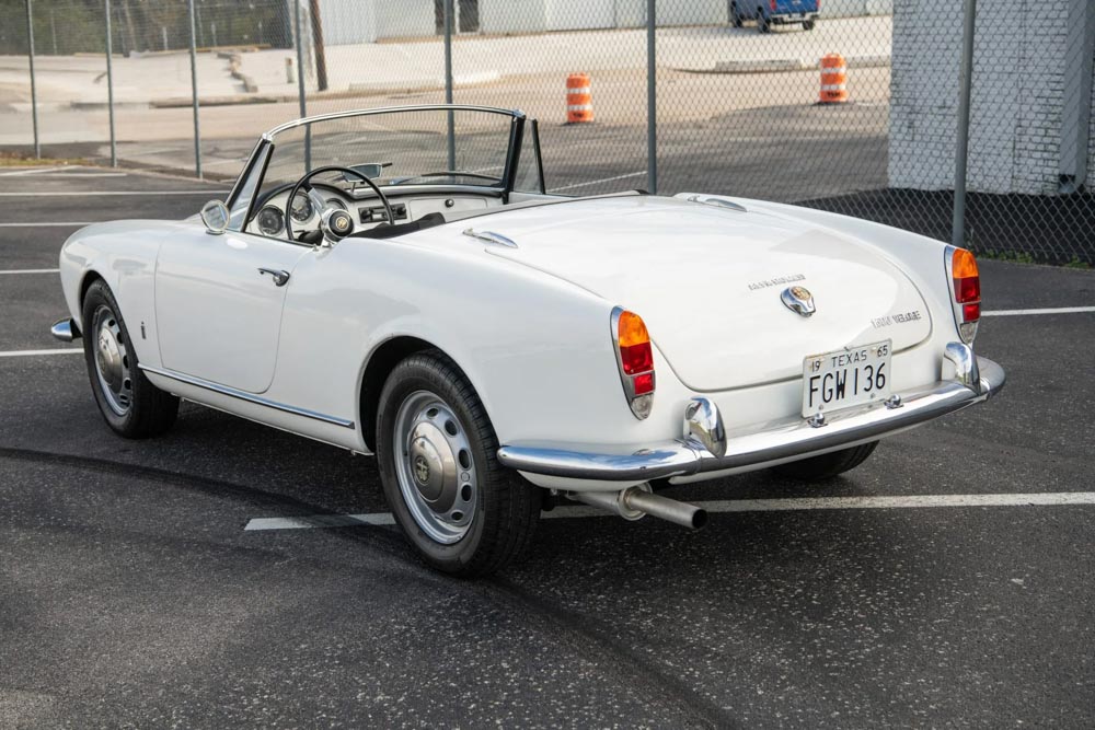 The 101-Series chassis was announced in 1959 as an evolution of the 750 platform and featured a lengthened wheelbase, larger rear lights, fixed side wing windows, and a stepped hood. The Pinin Farina–styled body of this example was repainted white and fitted with a replacement black soft top as part of the aforementioned refurbishment completed under current ownership. A bullet-style left-side mirror, chrome bumpers, and 1600 Veloce badging are further details. The rear window is clouded, the right-side reverse light is inoperable, and close-up photos of blemishes in the paint are provided in the gallery below.