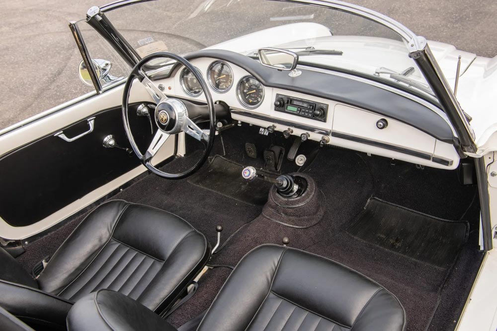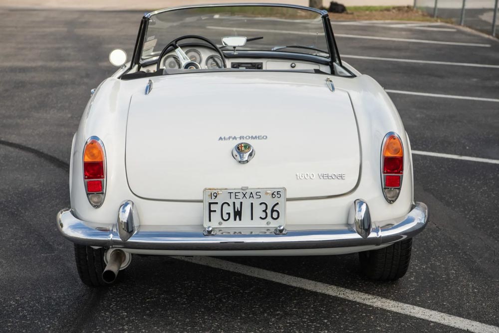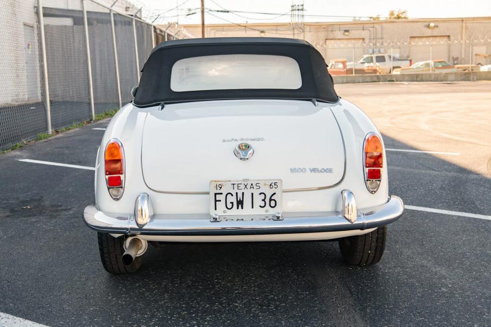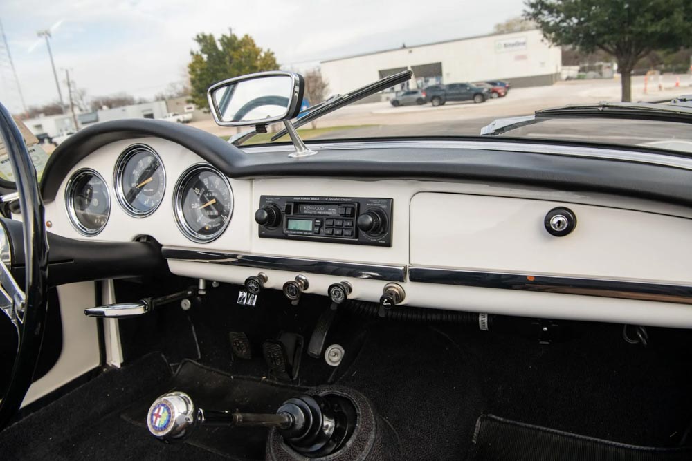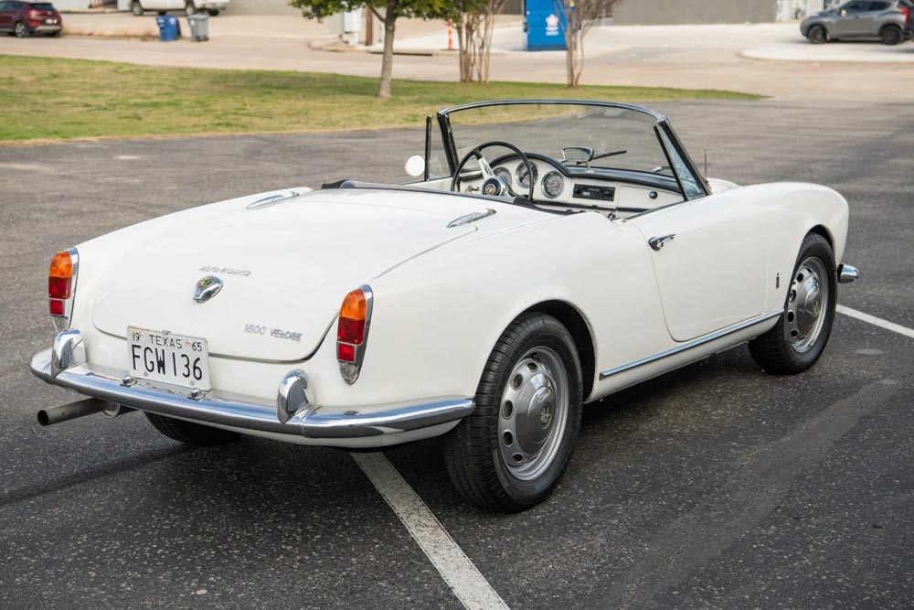 This 1965 Alfa Romeo Giulia Spider Veloce was acquired by the seller and their spouse in 1998 and refurbished over the following few years. The body was refinished in white, a replacement black convertible top was added, the interior was reupholstered in black vinyl, and the 1.6L twin-cam inline-four was rebuilt. Subsequent work in 2013 involved rebuilding the dual Weber carburetors as well as the brake master cylinder, front calipers, and rear wheel cylinders. Shifting is via a five-speed manual transmission, and further equipment includes Fergat 15″ wheels, a Kenwood cassette radio, and Veglia instrumentation. This 101-Series Spider Veloce is now offered with partial service records, refurbishment photos, a 1998 appraisal document, and a clean Texas title in the name of the seller’s spouse.