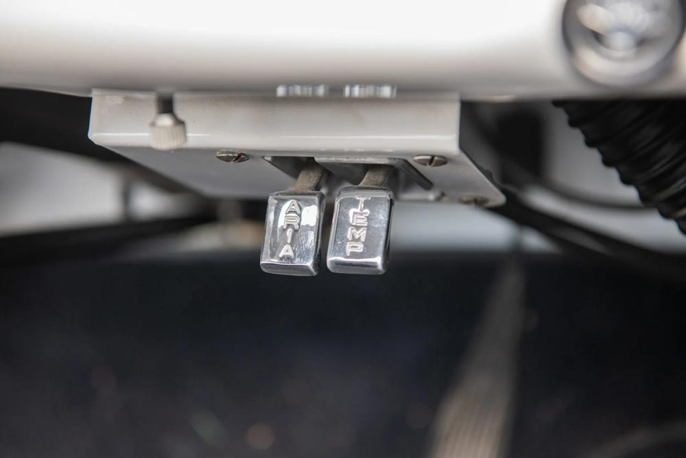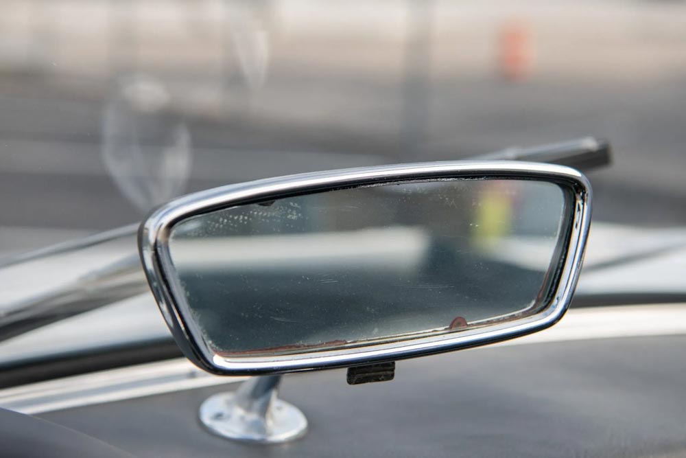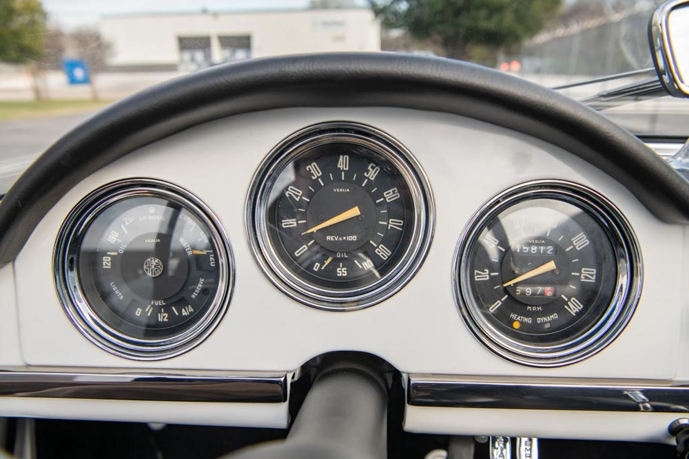 The three-spoke steering wheel fronts Veglia instrumentation consisting of a central 8k-rpm tachometer with an inset oil pressure gauge flanked by a 140-mph speedometer and a combination gauge for fuel level, oil temperature, and coolant temperature. The five-digit odometer shows 46k miles, less than 1k of which were added under current ownership.