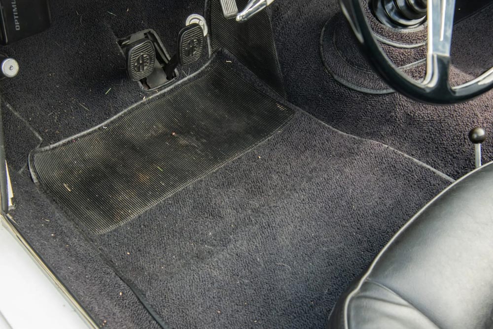The low-back bucket seats have been reupholstered in black vinyl and are accompanied by a color-coordinated upper dashboard pad, door panel inserts, and carpets. Further appointments include a Kenwood cassette radio, a cabin heater, and lap belts.