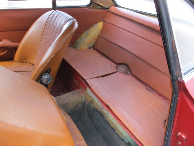 The body does need some rust and dent repairs as there is a dent in the right front fender along with a few smaller ones primarily on the passenger side. There is some rust which is most prominent in the driver’s side rocker panel and front fender along with some cosmetic rust around the left rear wheel well and the lower front fenders. The rocker panels were reinforced when current owner acquired the car. The doors open and close fine. Car was originally dark green but at some point was given a mediocre red paint job. One of the hubcaps is missing.