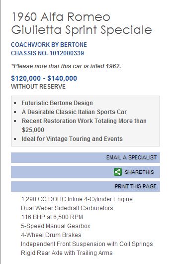 To be OFFERED AT AUCTION at Auctions America's Fort Lauderdale event, March 27-29, 2015.Estimate:$ 90,000 - $120,000 Almost any car has its share of interesting features, and some, naturally, are more exciting than others. Occasionally a car is introduced that is widely considered to be extra special. This was the response to the Alfa Romeo Giulietta Sprint Speciale. According to period relevant Road & Track magazines, the Giulietta Sprint Speciale was launched in 1958 at the Turin Auto Show. It represented a stunning design that was clearly derived from the futuristic Berlina Aerodinamica Tecnica, or B.A.T., show cars that had been created by Carrozzeria Bertone in the mid-1950s. The amazingly aerodynamic design boasts a drag coefficient of only .29, which is particularly low, even by today's standards. Those aerodynamic studies led to what seemed a perfect solution to a competition version of the Bertone-bodied Giulietta Sprint Veloce. However, the Sprint Speciale proved to be a bit heavy for the task, and instead, it became a stylish road car, adding a sizable amount of grand touring flash to the entry-level Alfa Romeo line. As with all Giulietta Sprint Speciales, this car is equipped with the effective 1.3-liter, Veloce-specification twin-cam, four-cylinder engine, which has twin two-barrel Weber carburetors that put out 116 horsepower. A five-speed manual gearbox is connected to this powerplant. Even with a fully equipped interior, the Sprint Speciale has been constructed with lightweight construction and competition in mind, and it was considerably rapid. Reportedly, only 1,366 were produced by the time the model concluded in 1962. This particular car has been subjected to an excellent restoration, making the car ideal of both showing and touring. This Sprint Speciale is reported to have been delivered new in Italy and was subsequently imported into the United States. A complete and thorough restoration was initially undertaken in 1987 and completed in 2012. The last five years has seen the majority of the work carried out, and since the completion, it has been driven sparingly. Among the extensive work that has been completed is a rebuild of the original engine by Radcliffe Motorcar Company northwest of Baltimore. Other tasks that have been completed includes cleaning and rebuilding the carburetors, all exterior chrome being refreshed, plus the door panels and dashboard vinyl were re-installed in a great effort to preserve originality. The braking system has been refurbished and a new N.O.S. 101 head has been fitted. Additional features include the installation of new dome lights, period-correct floor mats, new emblems and data plates, as well as new grille blades and a new battery. Accompanying the Sprint Speciale are extensive receipts and service records which document much of the restoration work. The Sprint Speciale is one of the most attractive Alfa Romeos of its era. It is a car that is at home on any vintage rally, and it always stands out, even among the most elite of sports-racing cars. As a road car, the Sprint Speciale is ideal: fast, comfortable, safe and economical. You'll have the knowledge that you own a rare automobile from a highly regarded and respected Italian firm. Presented here is an example ready to be driven with enjoyment on any twisting mountain route, open desert road, or lazy country drive. This Giulietta Sprint Speciale adds to that a level of restoration that ensures it will turn heads wherever it may appear.