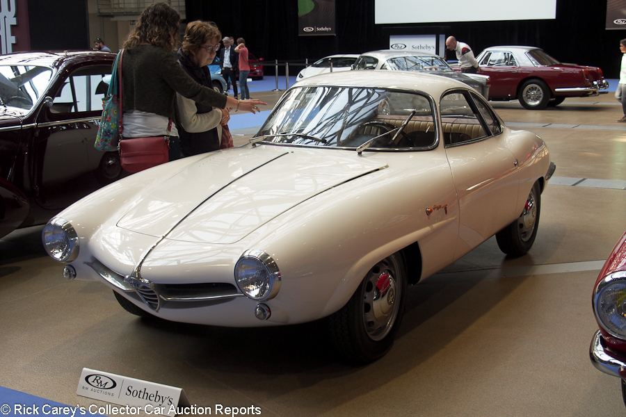 Lot # 166 1959 Alfa Romeo Giulietta Sprint Speciale ‘Muso Basso’; S/N AR1012000068; White/Tan, Beige vinyl; Estimate $418,285 – $537,795; Recent restoration, 2- condition; With Reserve; Hammered Sold at $406,334 plus commission of 13.97%; Final Price $463,101. – Silver steel wheels, hubcaps, Vredestein tires. – Early “low nose” body style. Missing panel under the dashboard. Excellent fresh paint and interior. The underbody is done like new but the engine is inaccessible. Scratched windshield. Scuffed headlight bezels and grille bar. Represented as the original engine, gearbox and rear axle, restoration completed just before the auction, but curiously unsatisfying. – Even for the low nose early body style (101 built) and month-old restoration this is a generous price that puts great faith in the restoration’s quality with little time to test it out as evidenced by the five miles on the odometer. There are too many little oversights to instill much confidence in it but the bidders didn’t seem to care. As it sits, it is expensive.